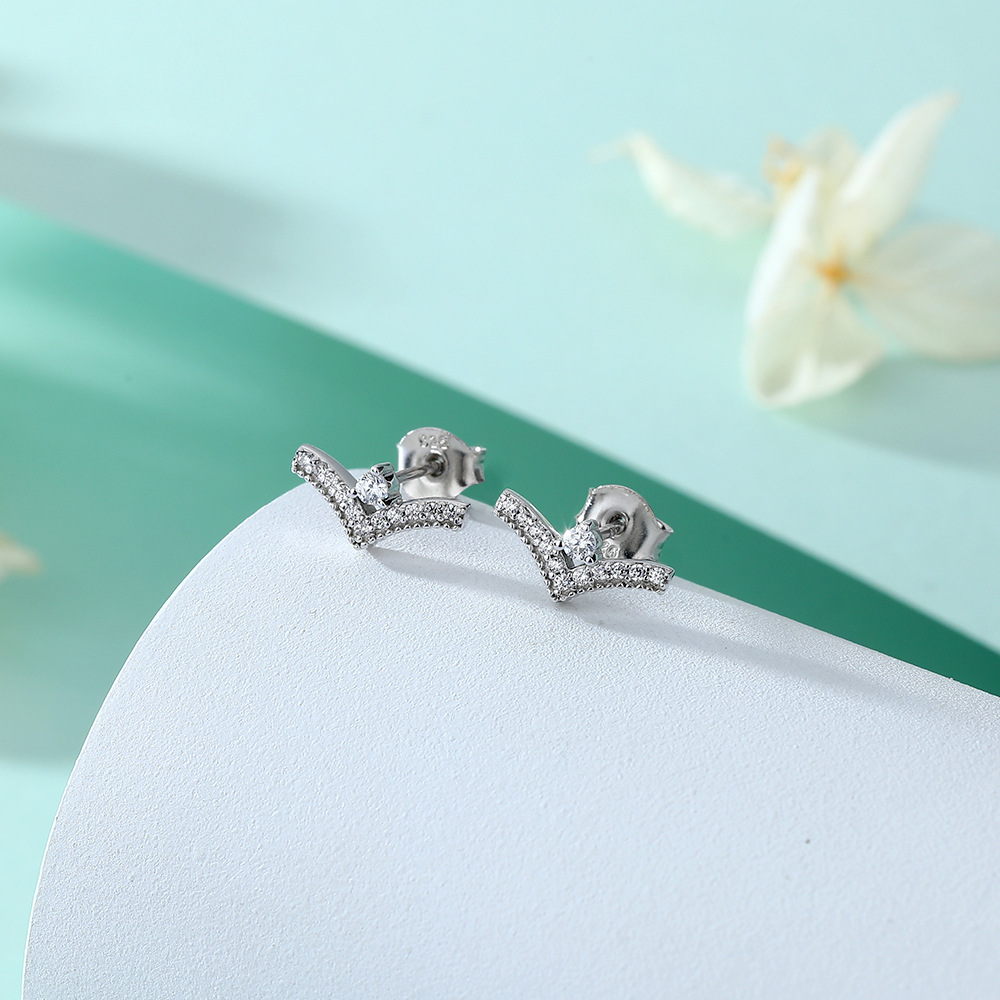 925 sterling silver jewelry set European and American V-shaped crown ring denier-shaped zircon pendant necklace simple earrings