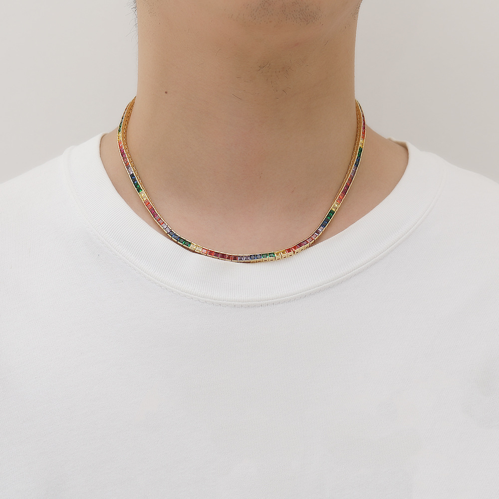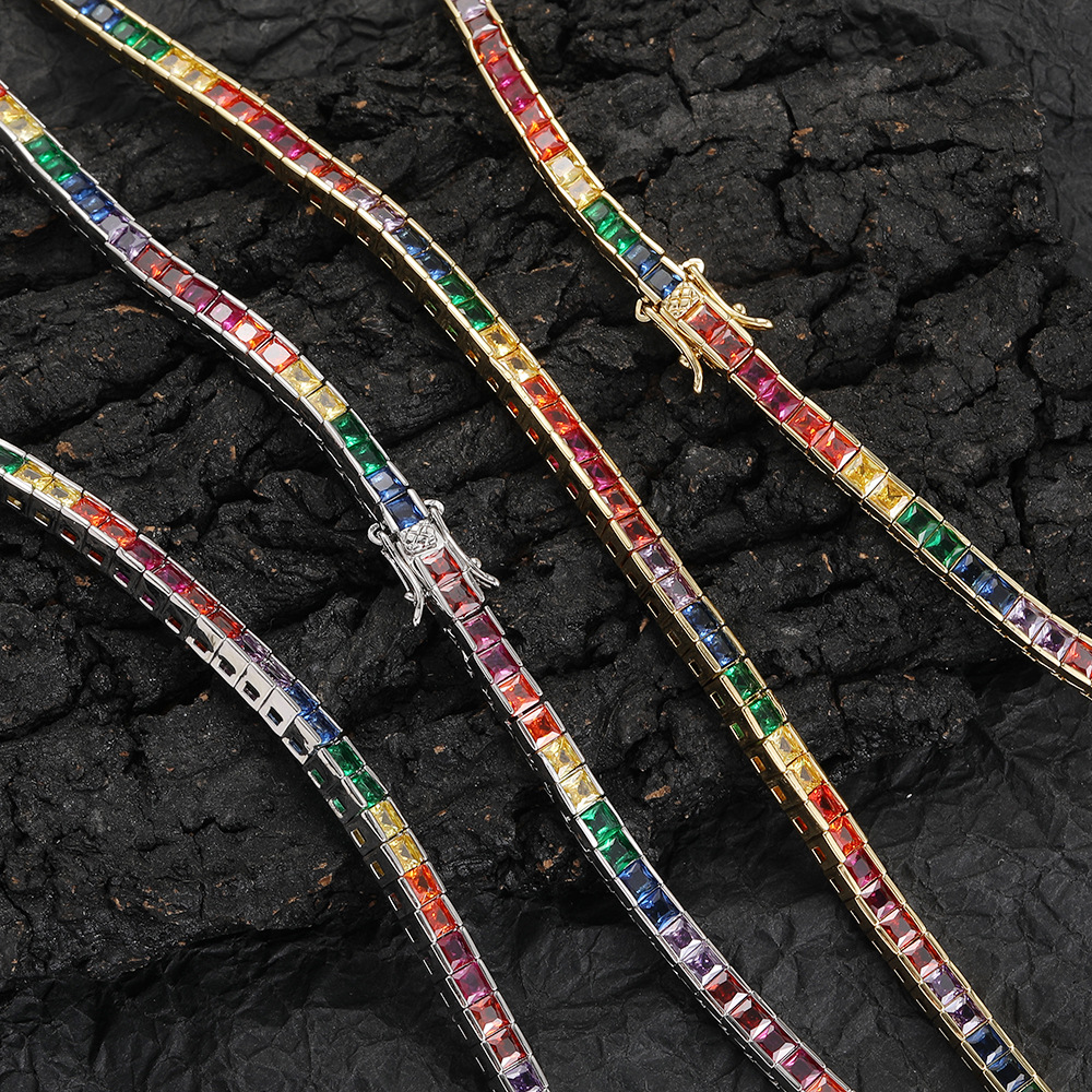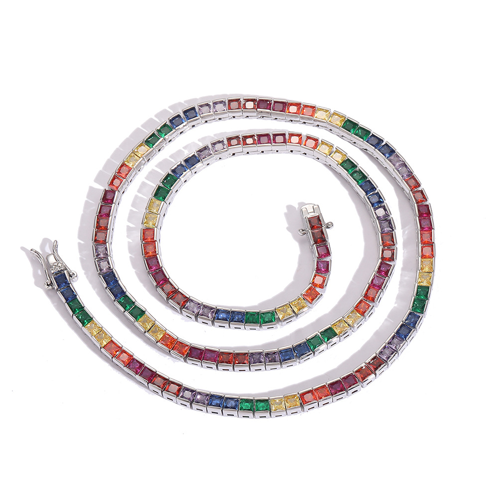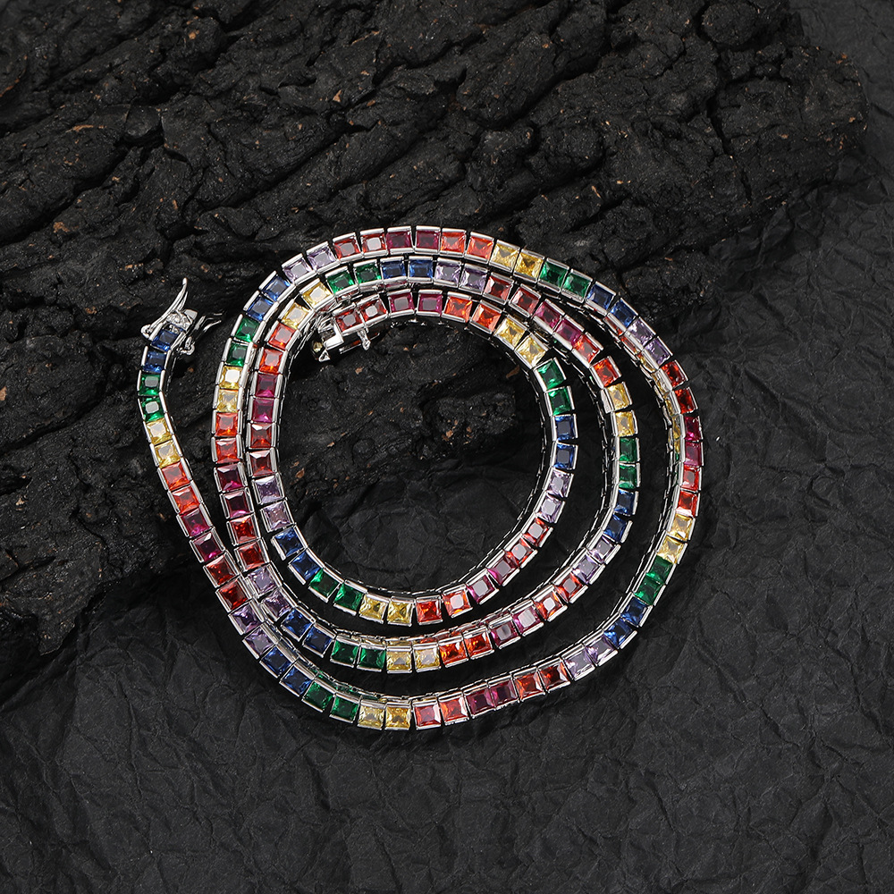 Hip Hop Copper Inlaid Zircon Tennis Chain 3mm Color Square Single Row Chain Necklace