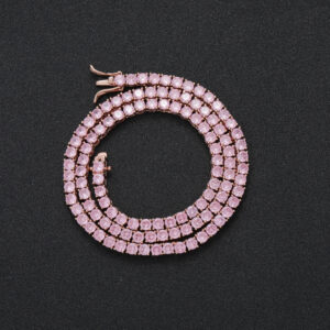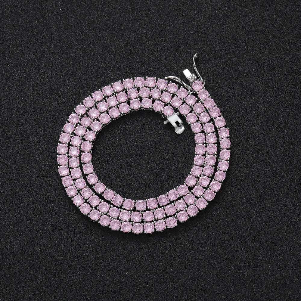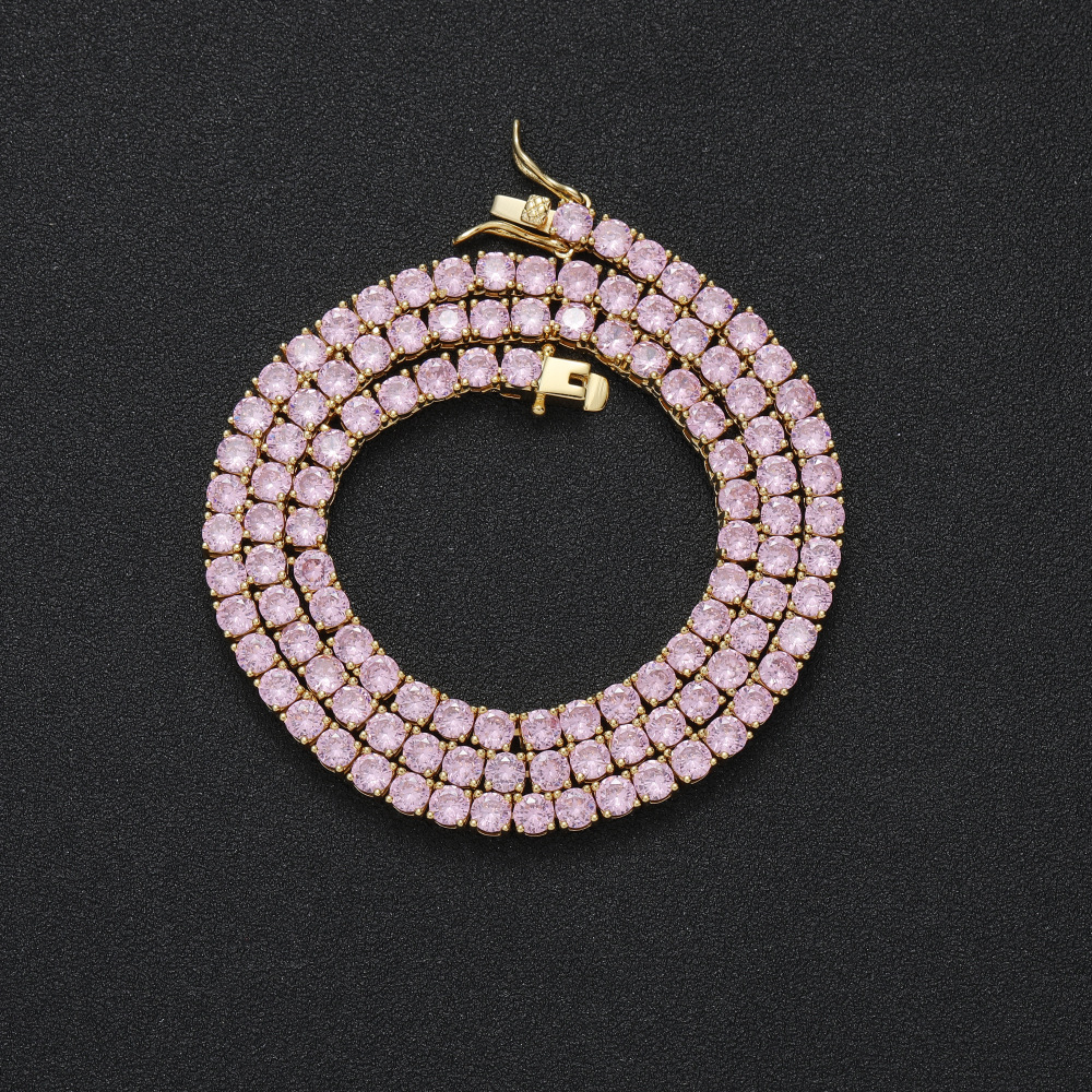 + Free ShippingHip Hop Copper Inlay Zircon Tennis Chain 4mm Pink Single Row Chain Necklace