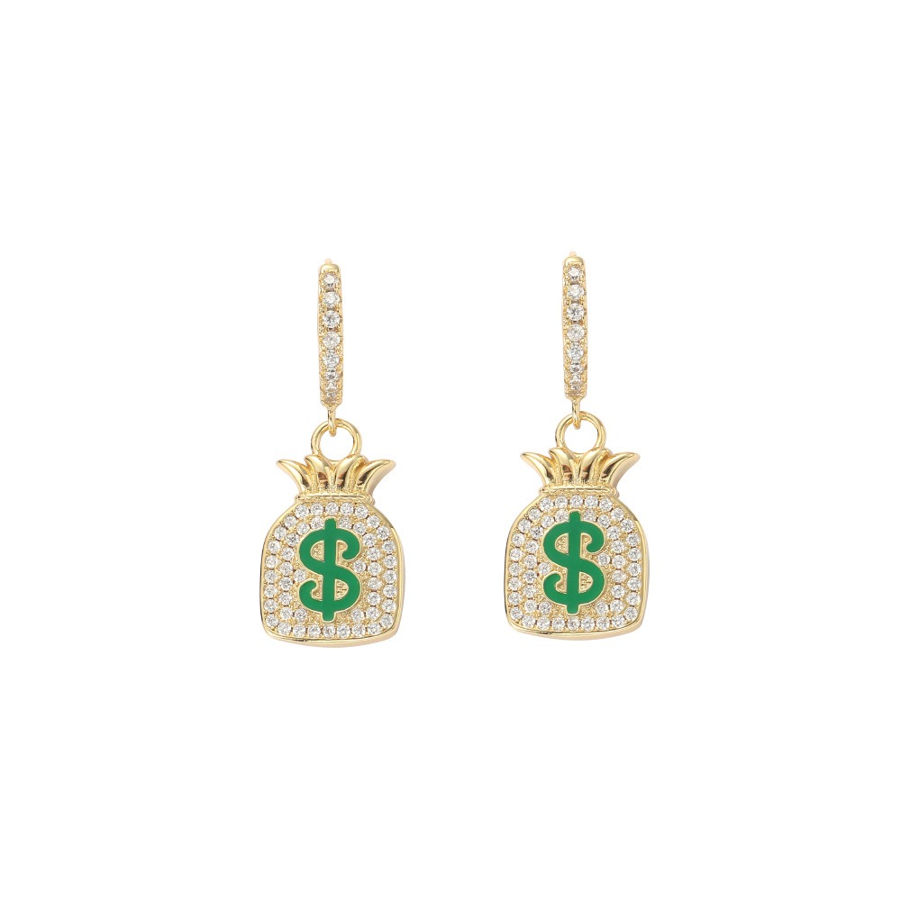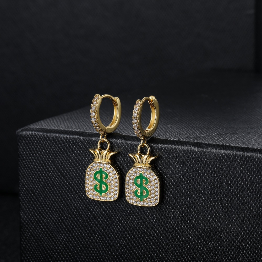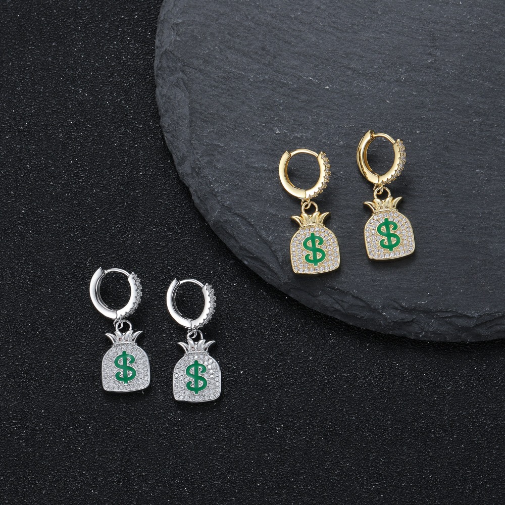 + Free ShippingDollar Sign Money Bag Earrings Hip Hop Full Zirconium Earrings Rock Men’s Earrings