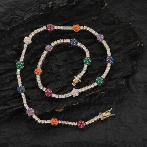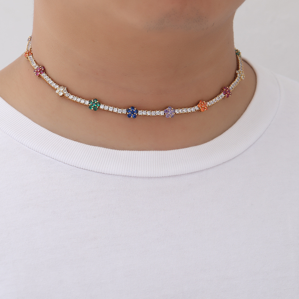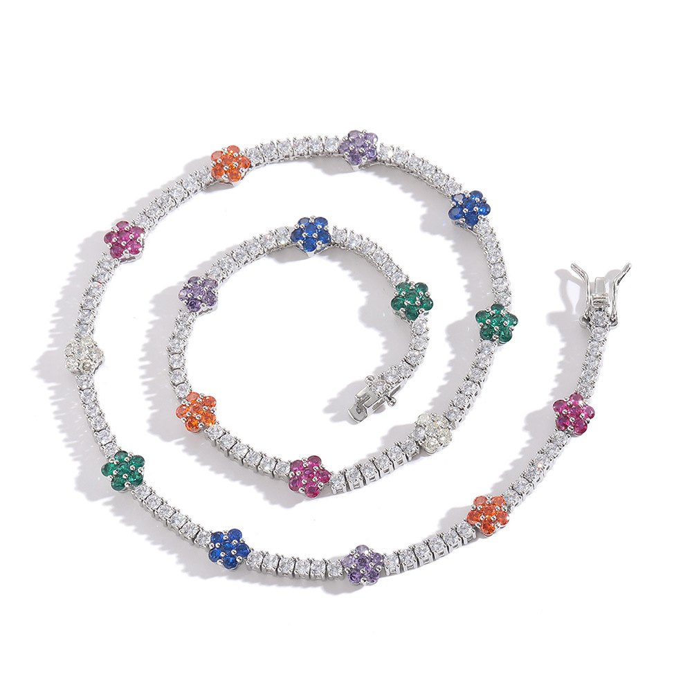 Copper Inlaid Zircon Colorful 2.5mm Single Row Tennis Chain Small Flower-shaped Hip Hop Necklace
