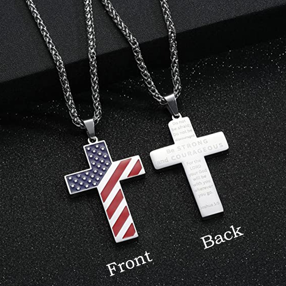 Personalized American Flag Patriotic Cross Necklace Christian Religious Bible Verse Pendant Jewelry for Men Women Memorial Gift