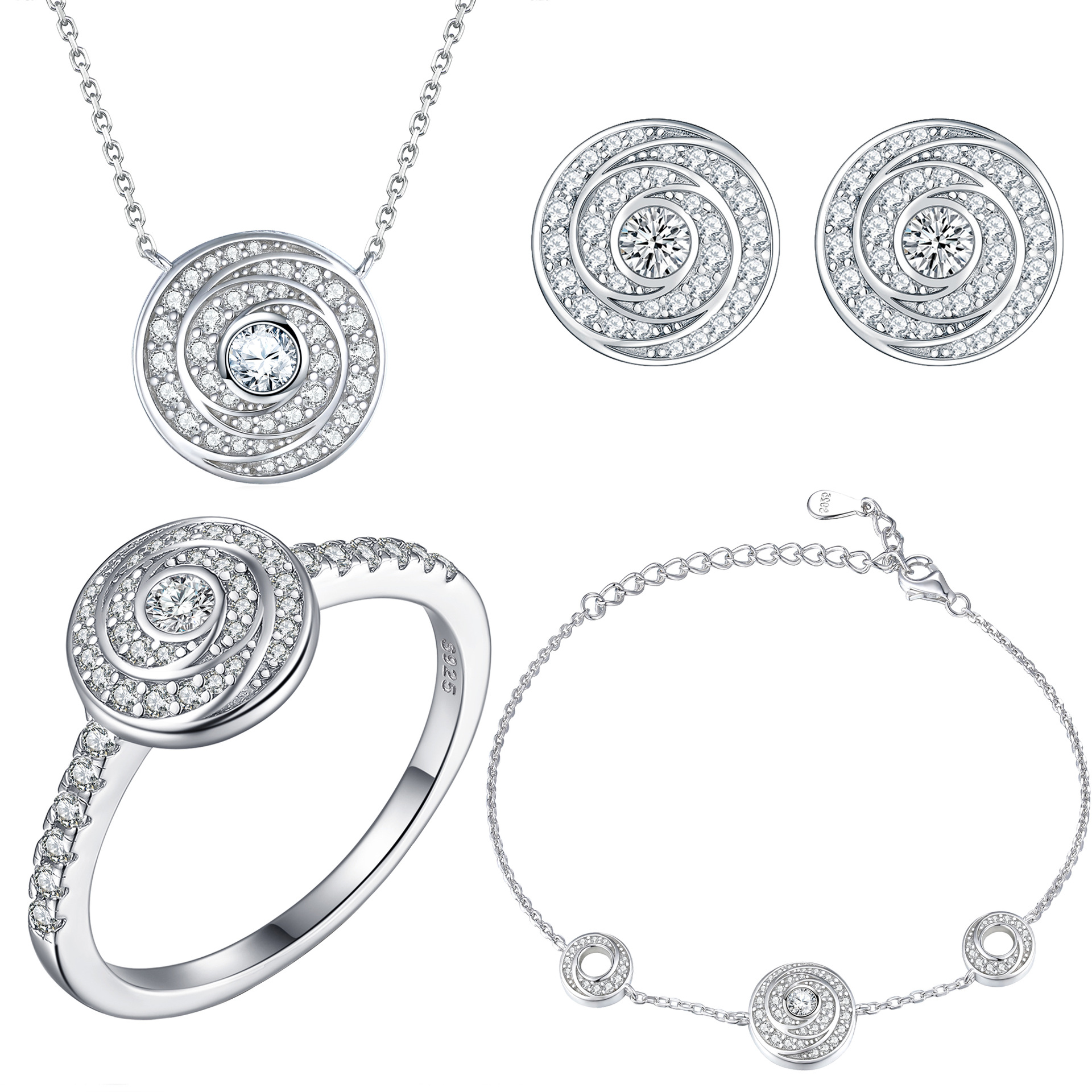 S925 Silver Ring Stud Earrings Necklace Bracelet Jewelry Diamond Plate Set of Four Jewelry set