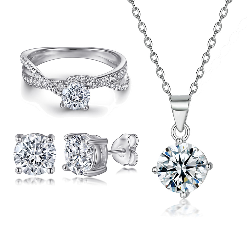 S925 sterling silver jewelry set four claw diamond ring zircon ribbon earrings fashionable necklace