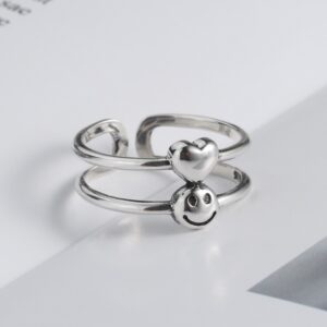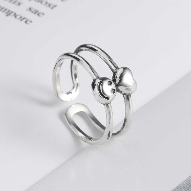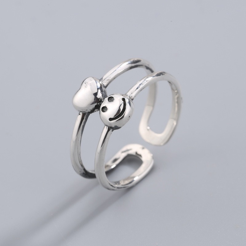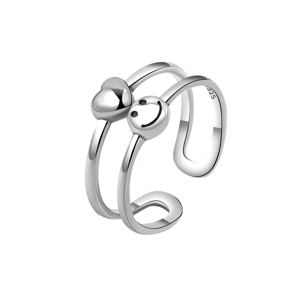 S925 sterling silver ring opening adjustable heart smiley face ring for women