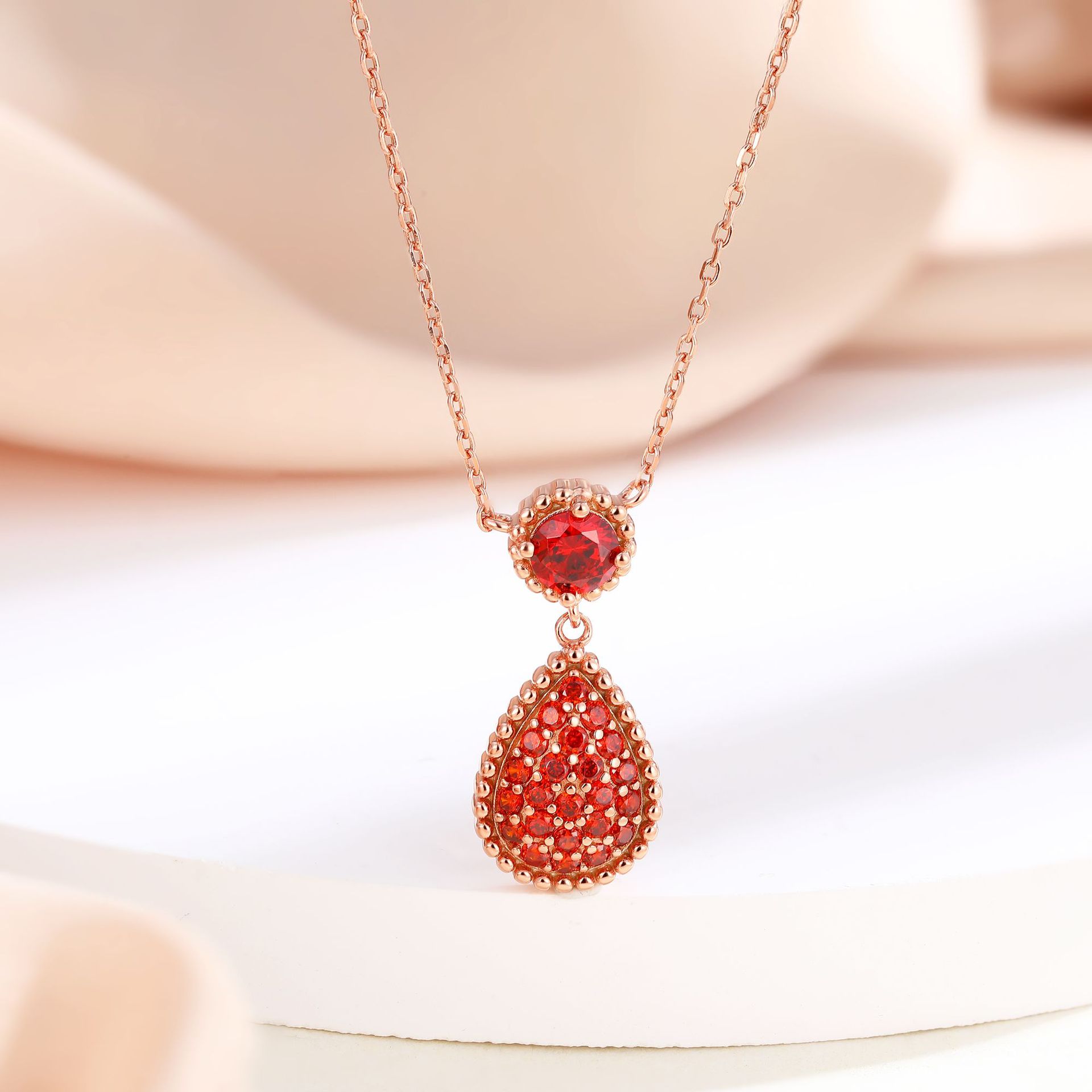 S925 sterling silver ruby garnet red zircon necklace luxury European and American rose gold water drop pendant