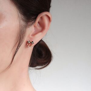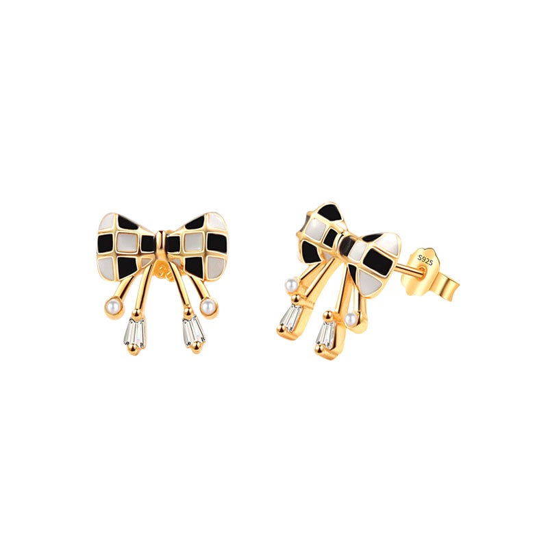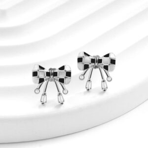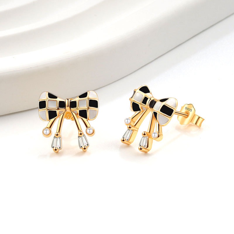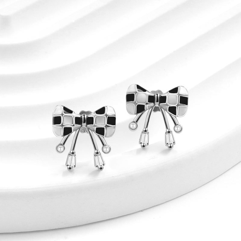 S925 sterling silver stud earrings black and white checkerboard bow earrings