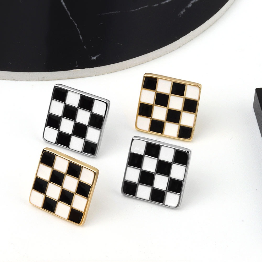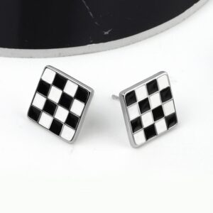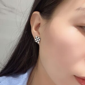 S925 sterling silver stud earrings square black and white checkerboard earrings