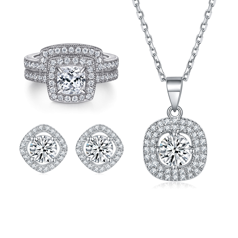 Square Rings S925 Sterling Silver Zircon Set Necklace Earrings Jewelry Set