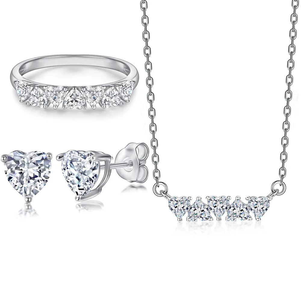 Sterling silver jewelry set heart shaped zircon stud earrings simple love ring 925 silver necklace
